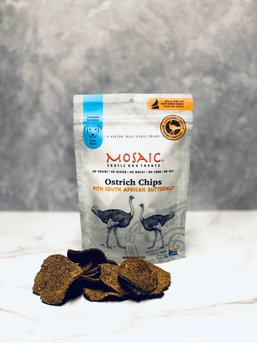 Mosaic South African Ostrich Chips are a perfect alternative for dogs that are affected by food allergies from common proteins, such as chicken, beef, and pork. These limited-ingredient, tasty treats are low in fat and low in calories, which may benefit dogs that suffer from weight control issues. Our exotic chips are infused with South African butternut, which is rich in vitamin A, vitamin C, fiber, and potassium.