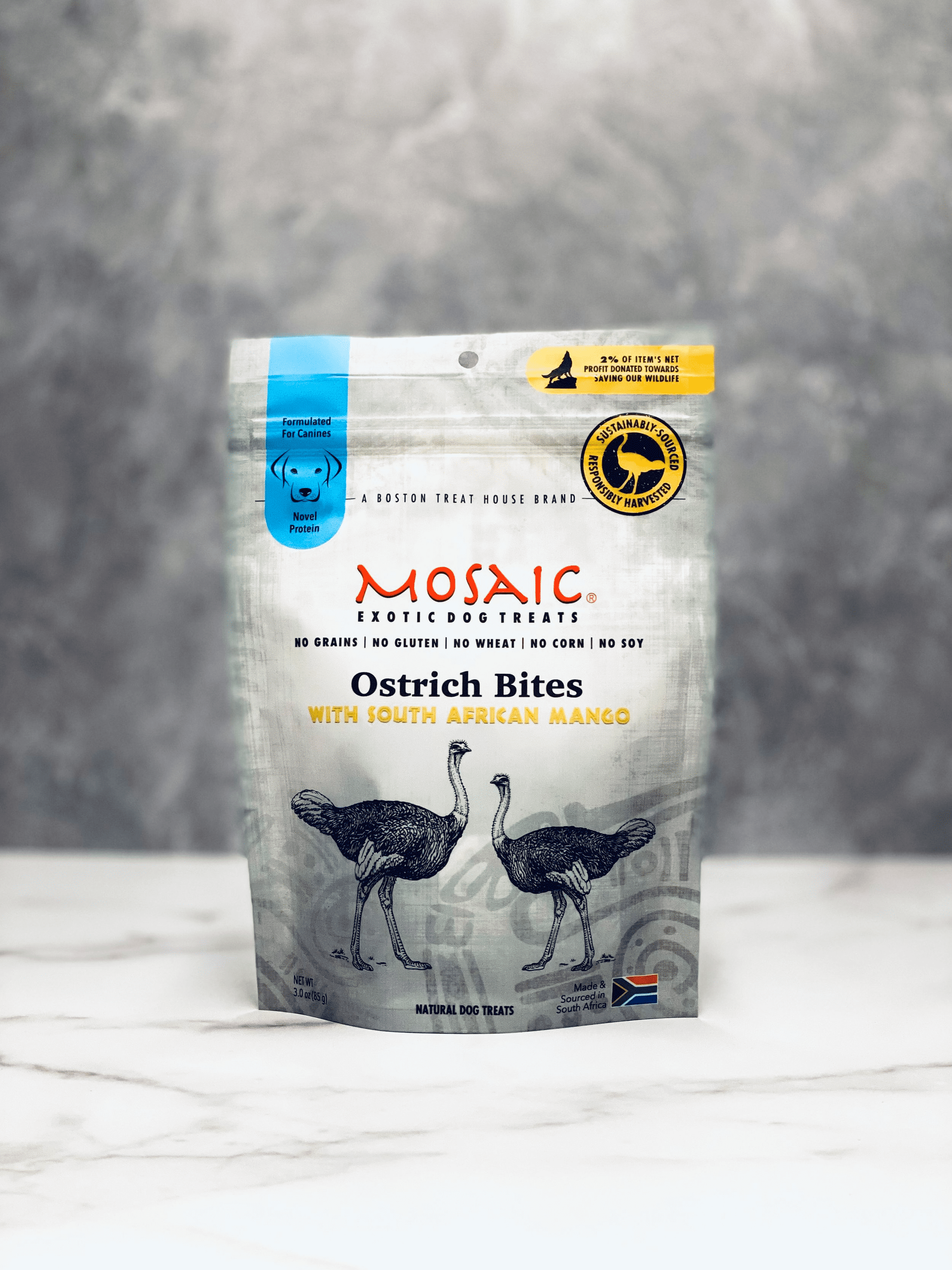 Mosaic South African Ostrich Bites are a perfect alternative for dogs that are affected by food allergies from common proteins, such as chicken, beef, and pork. These limited-ingredient, tasty treats are low in fat and low in calories, which may benefit dogs that suffer from weight control issues. Our exotic training treats are infused with South African mango, which is high in fiber, as well as vitamin A, B6, C, and E, making it quite nutritious for dogs.