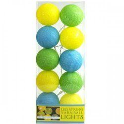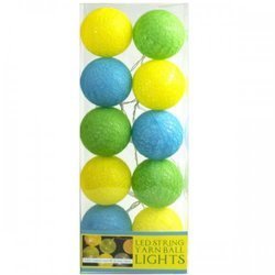 Package: 6Add a dash of warmth to your living space with this Multi-Colored Yarn Ball String Lights. It requires 2 AA batteries - not included. The string lights include ten long-lasting LED Light on a 4-foot cord and come in yellow, green, and blue colors. Great for celebrations or everyday decor. It comes packaged in a clear plastic box.