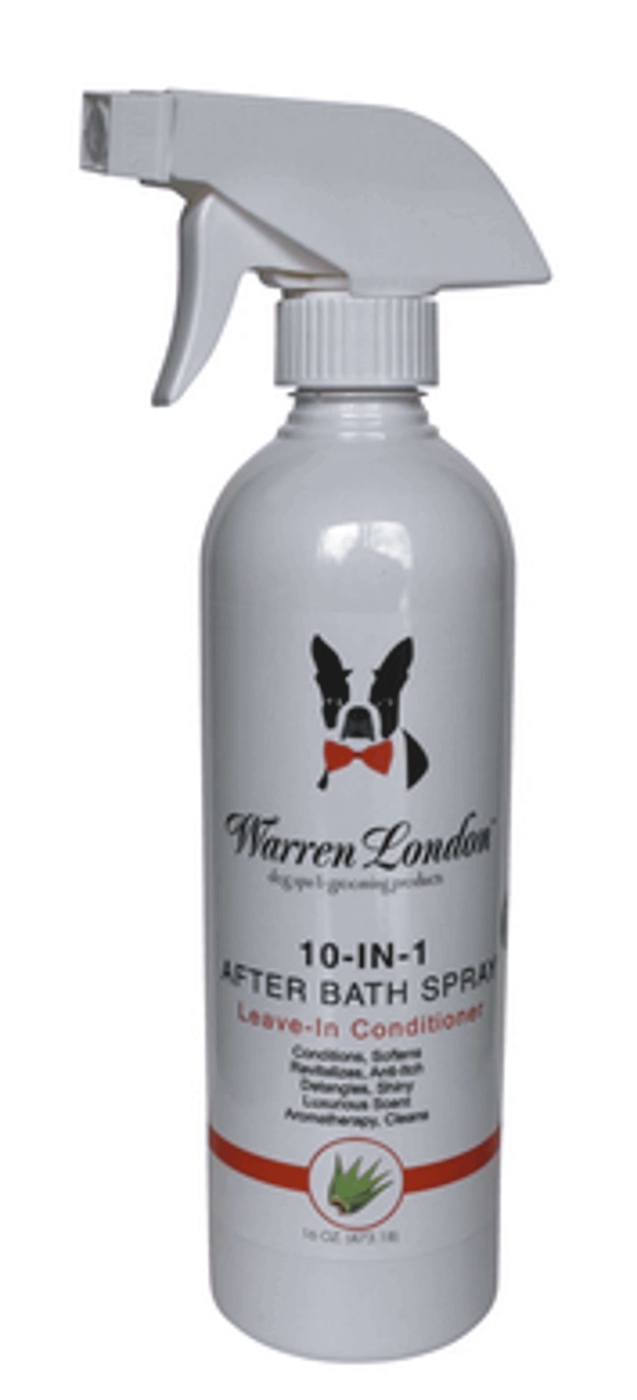 Warren London 10-in-1 After Bath Spray is a professionally formulated leave in conditioner spray with ten amazing benefits... Conditions, Softens, Revitalizes, Prevents Itch, Prevents Flake, Detangles, Shines, Luxurious Scent, Aromatherapy, and Cleans. Contains naturally simple ingredients infused with aloe vera, silk amino acids, and green tea leaf extract for healthy coat. Works on all coats. Simply spray with no need to rinse.