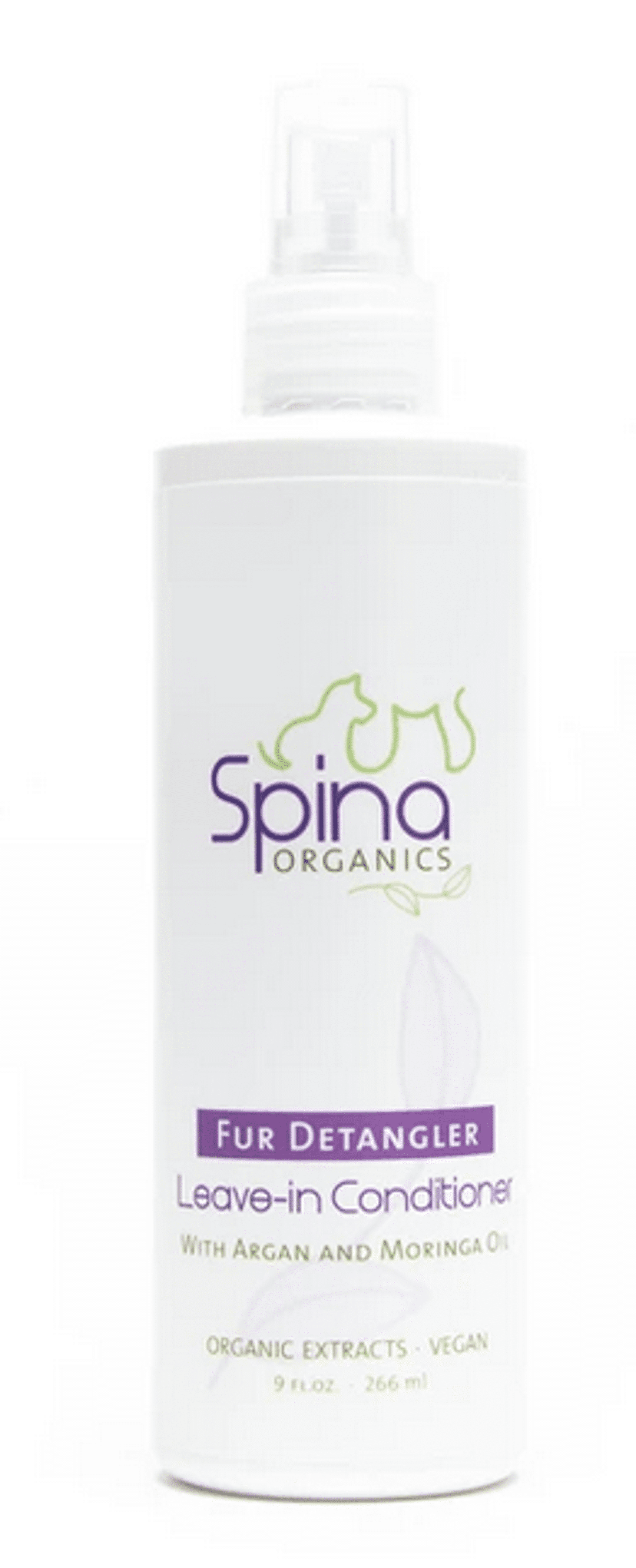 This lightweight Leave-In Conditioner Detangler leaves your dog's fur soft and nourished without weighing it down. Enriched with Argan and Moringa oils, our Leave-In Conditioner eliminates tangles and leaves fur static-free. After a Spina Organics Dog Body wash and towel-drying, lightly spray the Conditioner Detangler over your pet's coat and work it into the skin and fur with your fingers. Then, gently brush and dry the coat for amazing shine and softness.