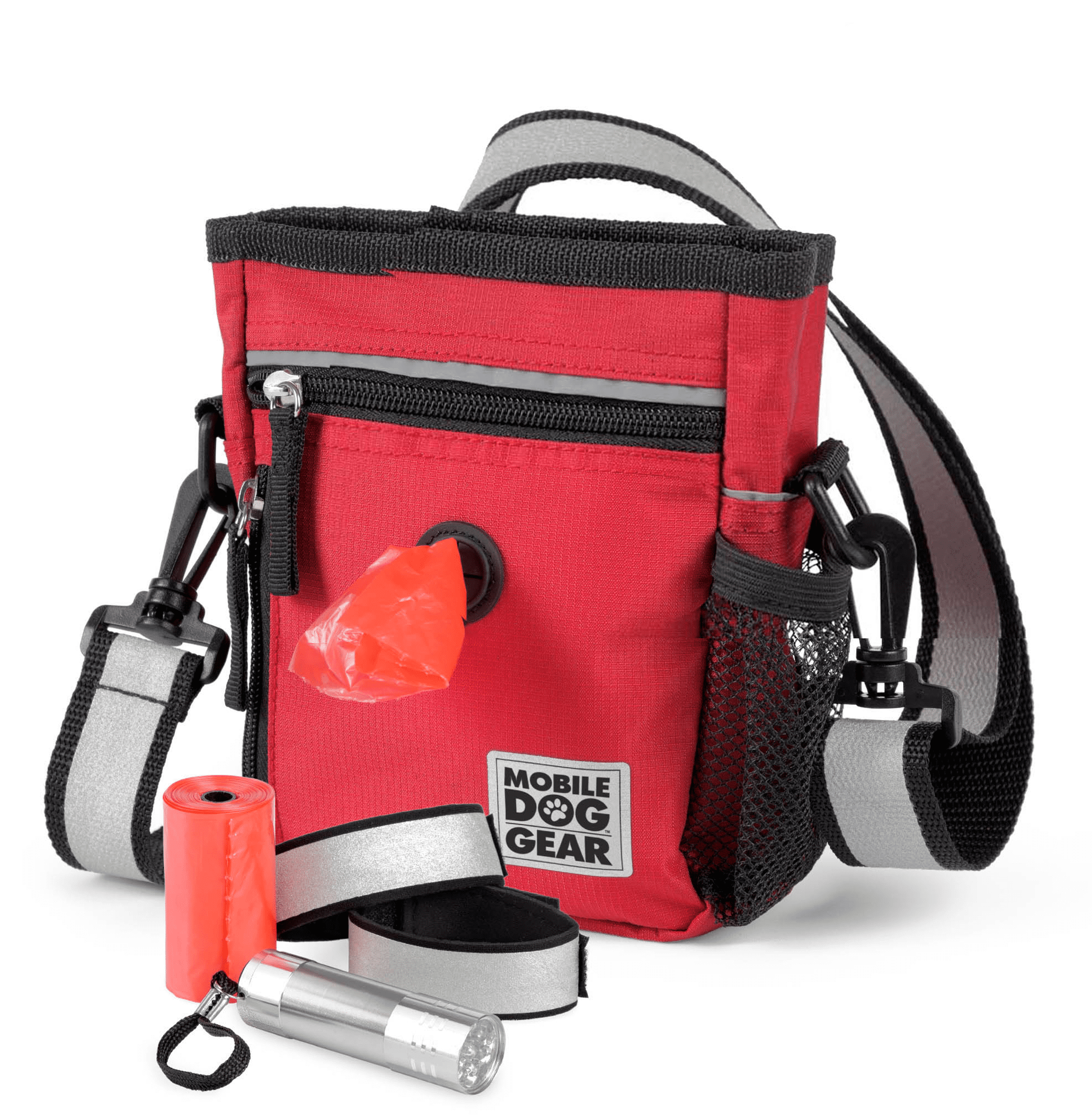 The Mobile Dog Gear Day/Night 6 Pc Walk Bag is the perfect size to hold your pets belongings while taking a walk, whether day or night. This pet travel bag can be used for any size dog and is ideal for dog walks; holding small items such as a water bottle, treats, leash, waste bags, and other essentials. This functional walking dog bag features: large main compartment, separate pocket for a roll of dog waste bags, dog waste bag dispenser, water resistant material, reflective trim on bag, mesh pocket for water bottle, and removable reflective shoulder strap. Also included is a pocket size flashlight, two reflective wrist straps for added visibility for night walks, and a roll of dog waste bags. This dog walk bag can be worn cross-body, over the shoulder, on the waist or with a belt hook.