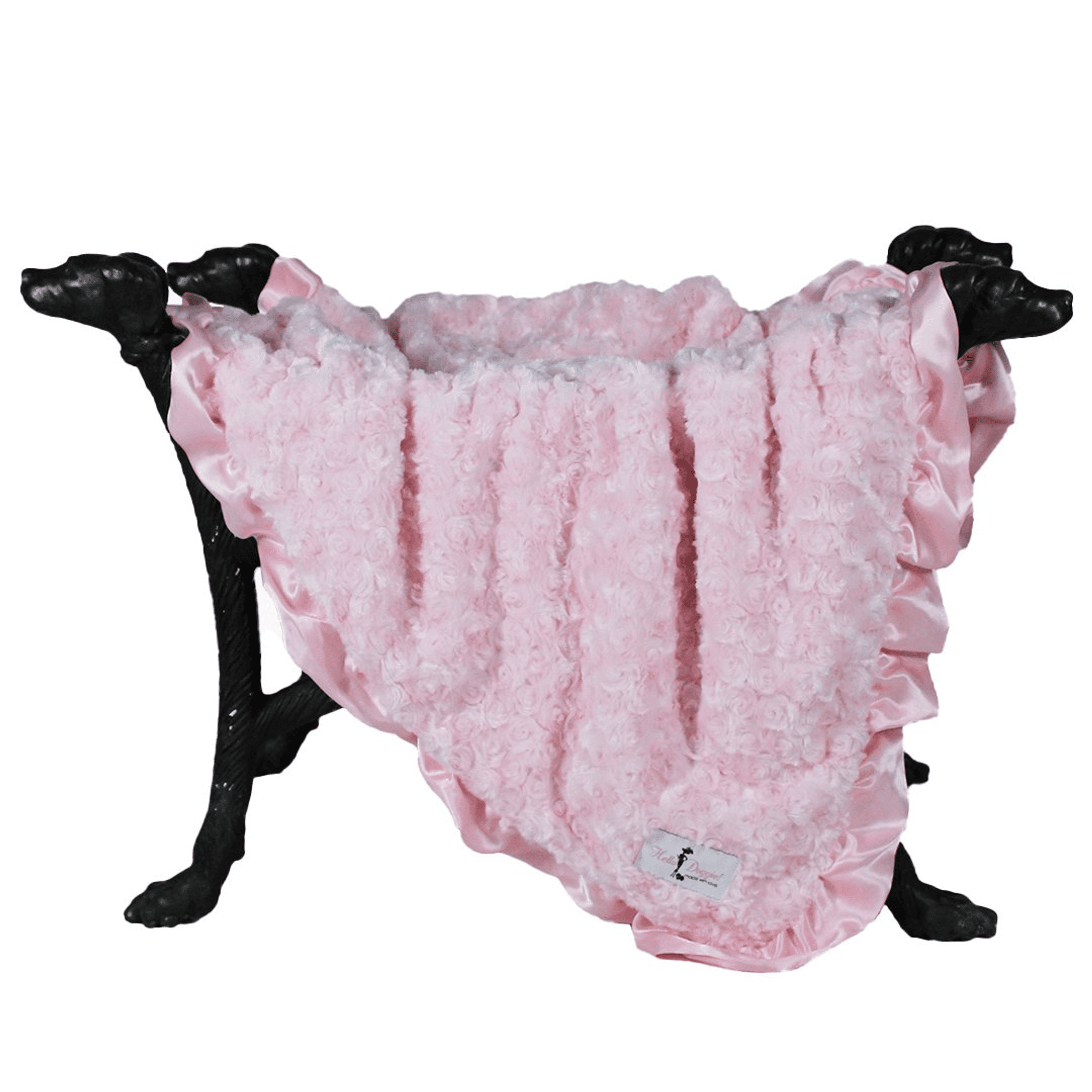 Snuggle your pup in this soft and silky dog blanket for a night of sweet dreams. This cozy dog blanket has a finishing touch of a ruffle satin trim. This blanket is perfectly paired with our dog cribs or any of the dog beds in the following colors available.