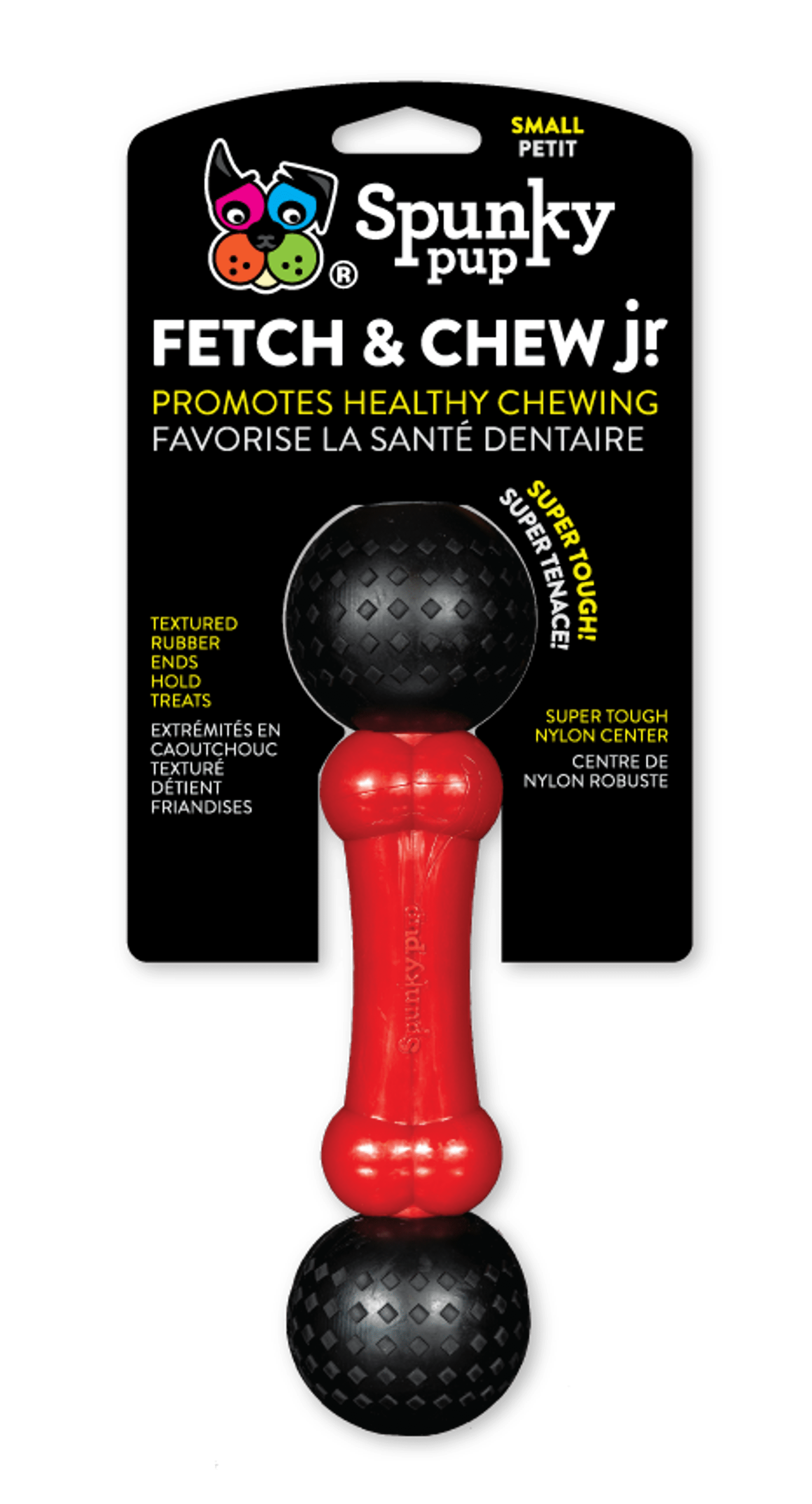 Great for tough chewers, the Fetch & Chew bone from Spunky Pup is made of a super tough nylon center with durable rubber end pieces.