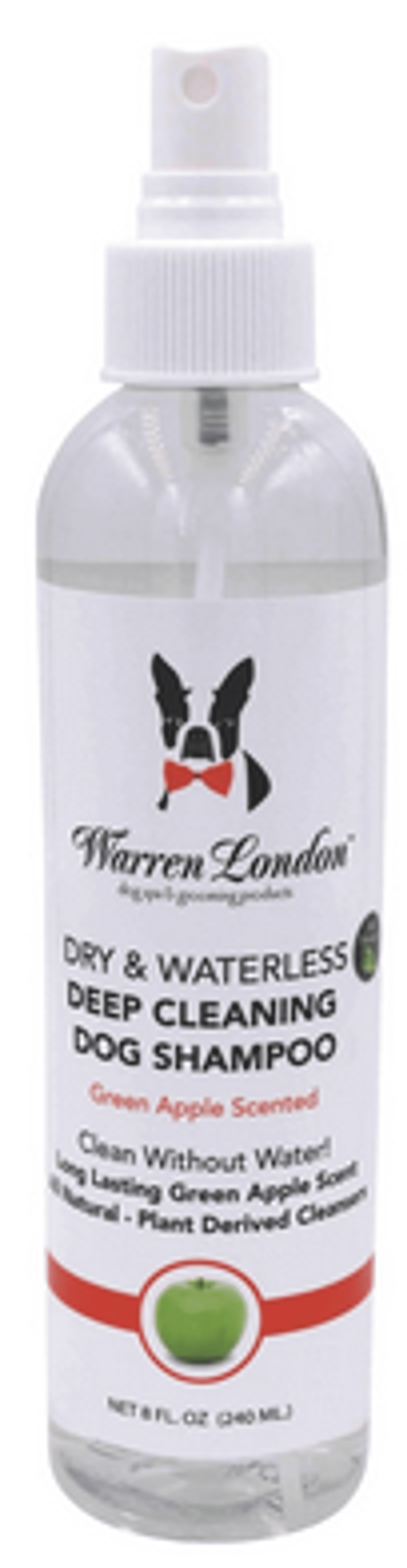 Warren London Dry & Waterless Deep Cleaning Shampoo is a convenient way to clean your dog in between baths while on the go without the mess. The simple no-rinse formula is quick and effective, and leaves the coat feeling and smelling fresh with a long lasting Green Apple scent. The formula is alcohol free and relies on naturally derived plant active ingredients to safely combat bacteria and clean skin & coat.